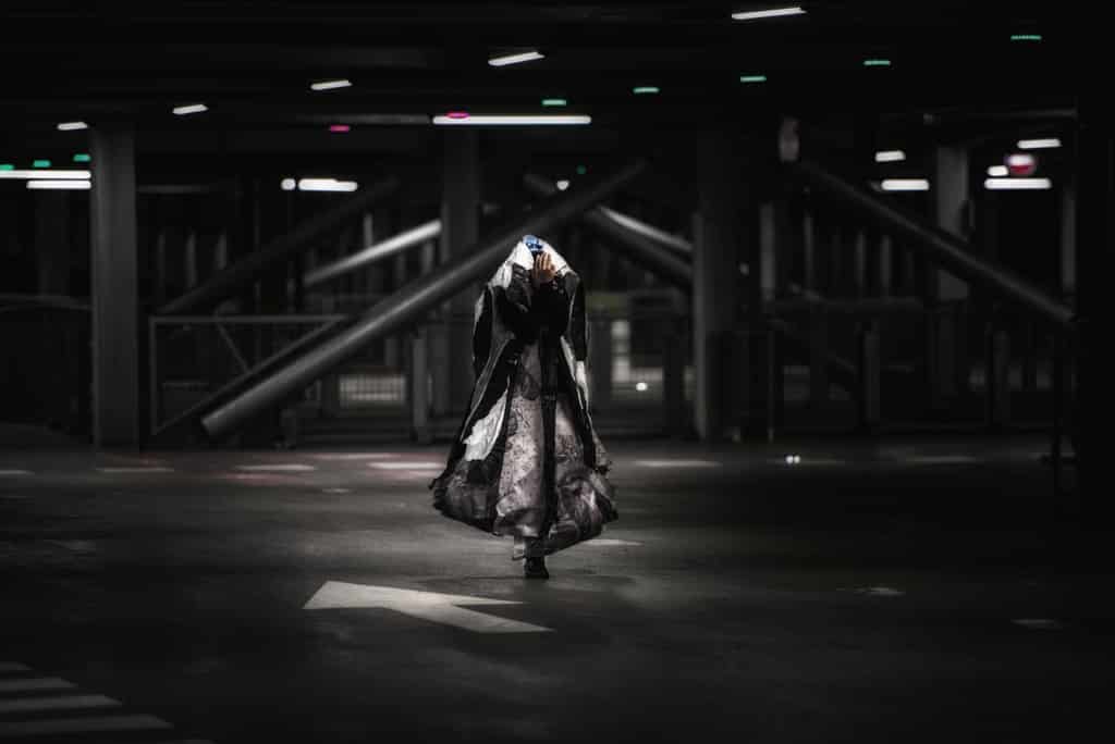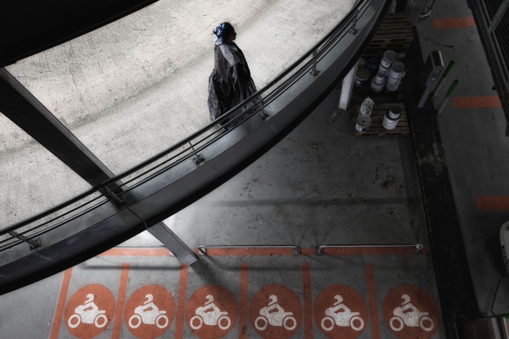 La série « Apparition » est née d’un manteau de papier fait à partir de cartes marines. Le modèle qui déambule joue par ses mouvements dans des lieux vides coupés de toutes animations humaines ; des espaces publics rendus privés, des lieux de rassemblement.
