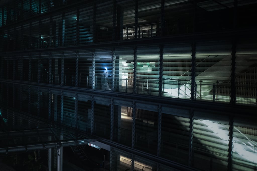 Elle, l’apparition arrive comme un phare, elle nous renvoie à notre rapport au sensible et au spirituel. Ses lumières froides sur le haut du crane ont été la première sources d’impression pour ces photos nocturnes.