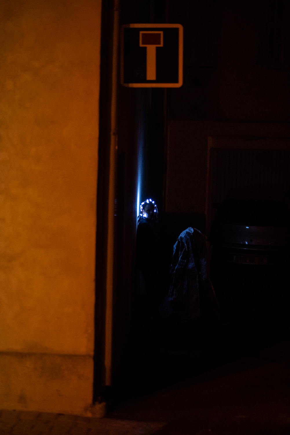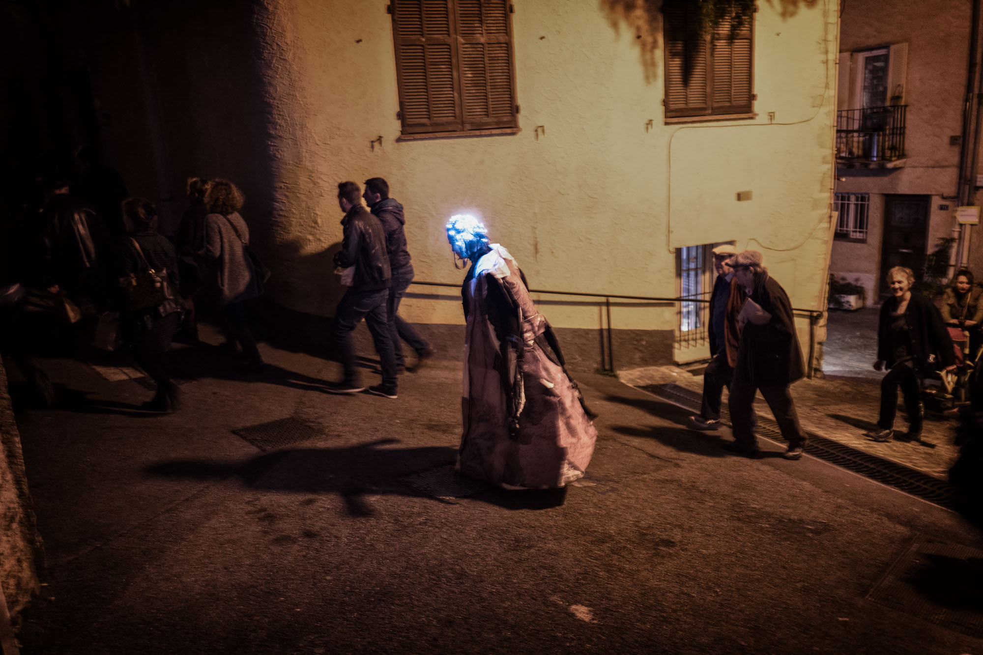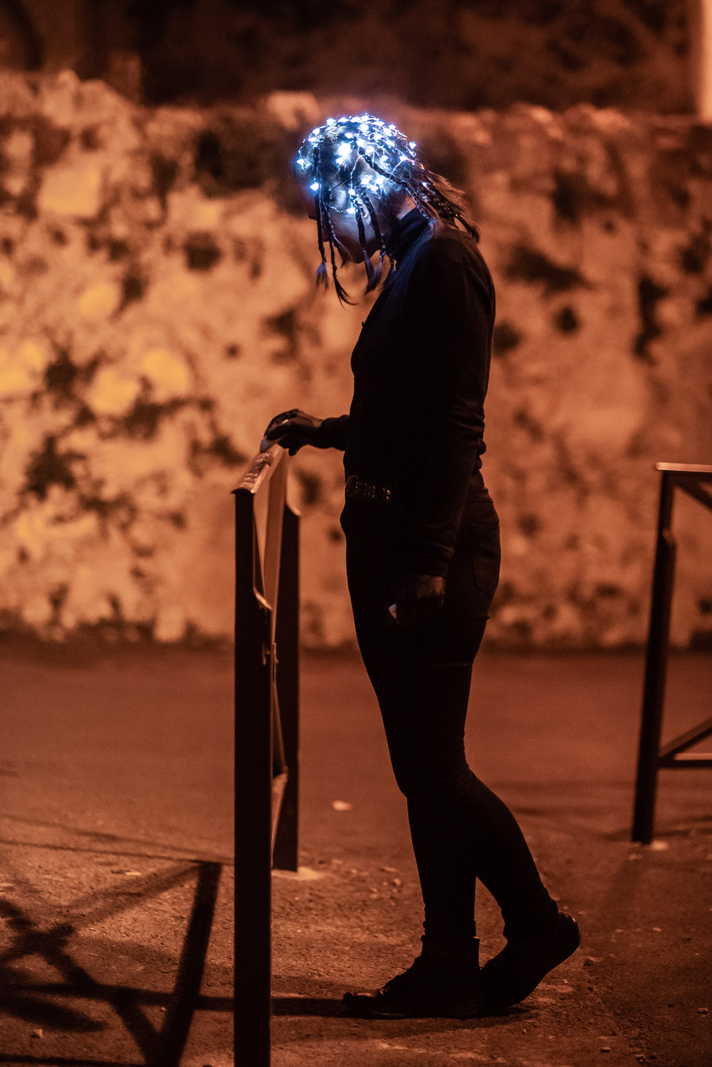 Un miracle qui perce les ombres du passé comme du futur.Une double projection.ElleTraverse,Comme un leurre,Elle,à part,Elle,S’inscrit dans l’espace et dans le temps.Une distorsion,Une lueur,Une partition dans la ville.Elle éclaire.Fantomatique,La foule visible ou invisible,Tel un phare,Elle donne un éclairage,Un certain regard,Des variations, des irisations.Voulons nous tout voir ?Qui voit tout, dans cet entre deux entre le visible et l’invisible ?Que pouvons nous désirer ou supporter de voir ?