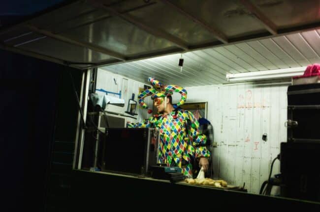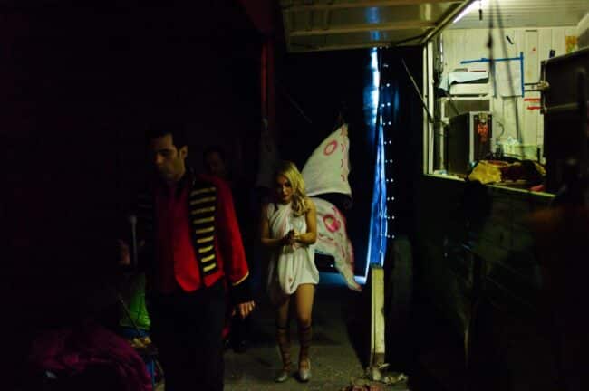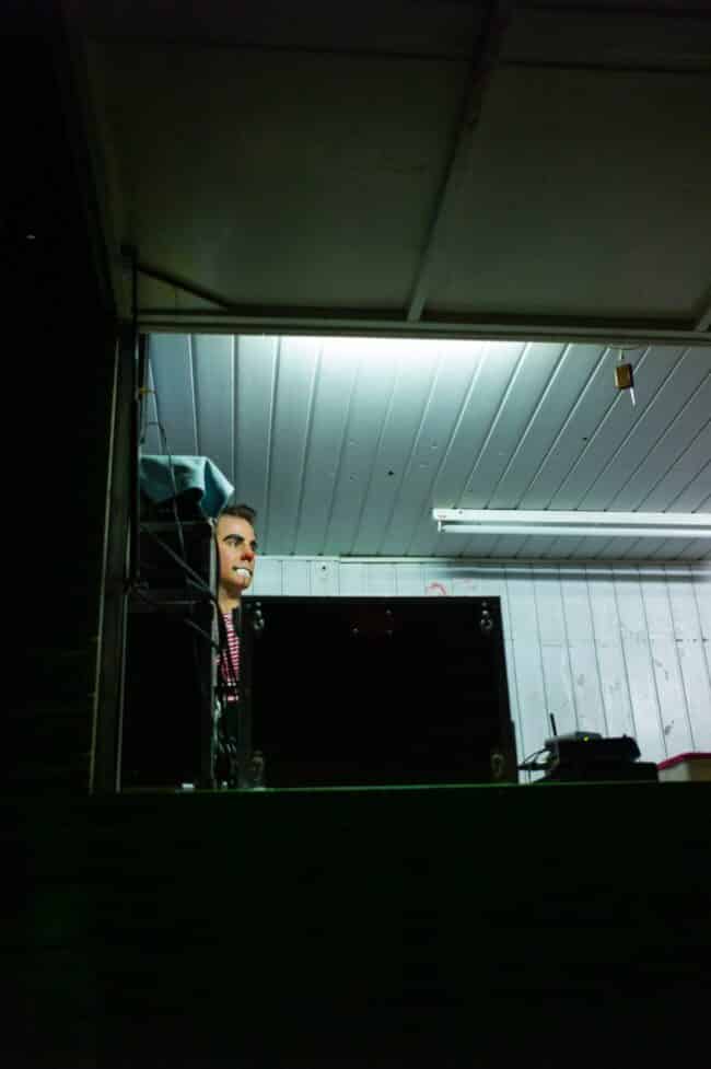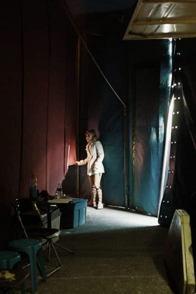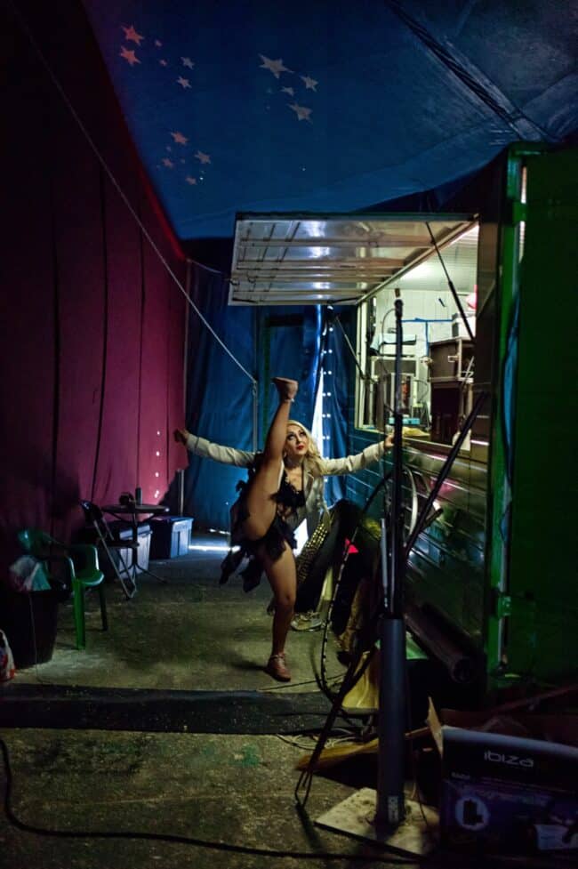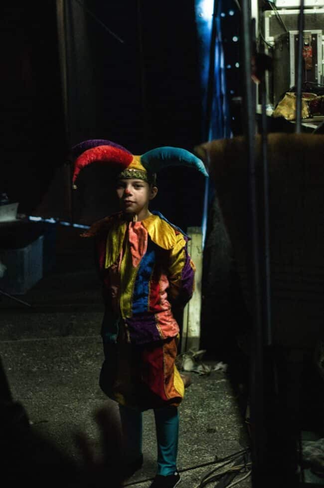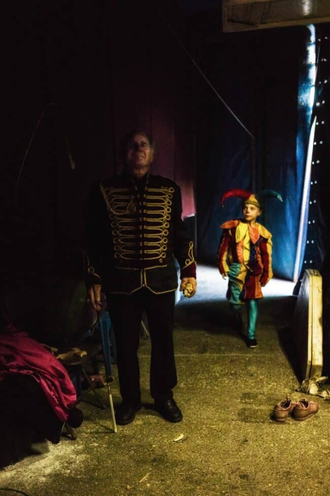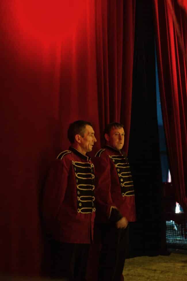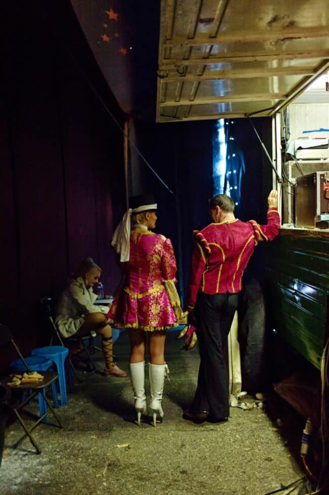 Dans l’arrière scène avant le spectacle, entre les numeros, on répète, on s’échauffe, on court…le temps est compté car ces artistes protéiformes sont à la fois clowns, installateurs, équilibristes, jongleurs, dompteurs…Mais derrière le Rideau, lorsque les masques tombent on percoit ce mélange de tension et de concentration si spécifique aux monde du spectacle vivant.