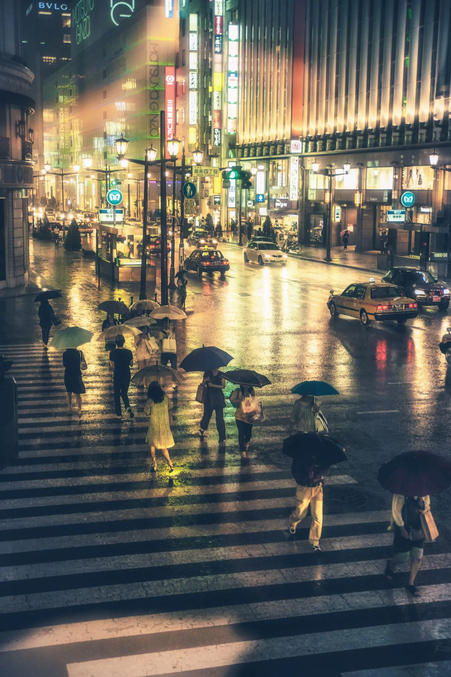 C’est le télescopage au quotidien entre la tradition et la modernité étroitement liées comme dans l’instantané de ces piétons sous la pluie qui nous renvoient au célèbre tableau d’Hiroshige.