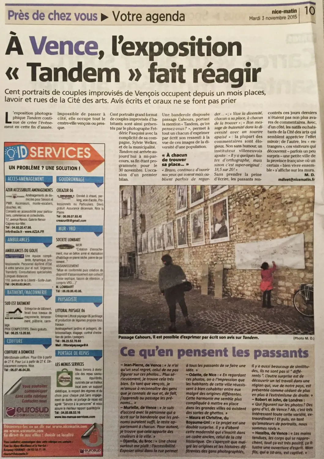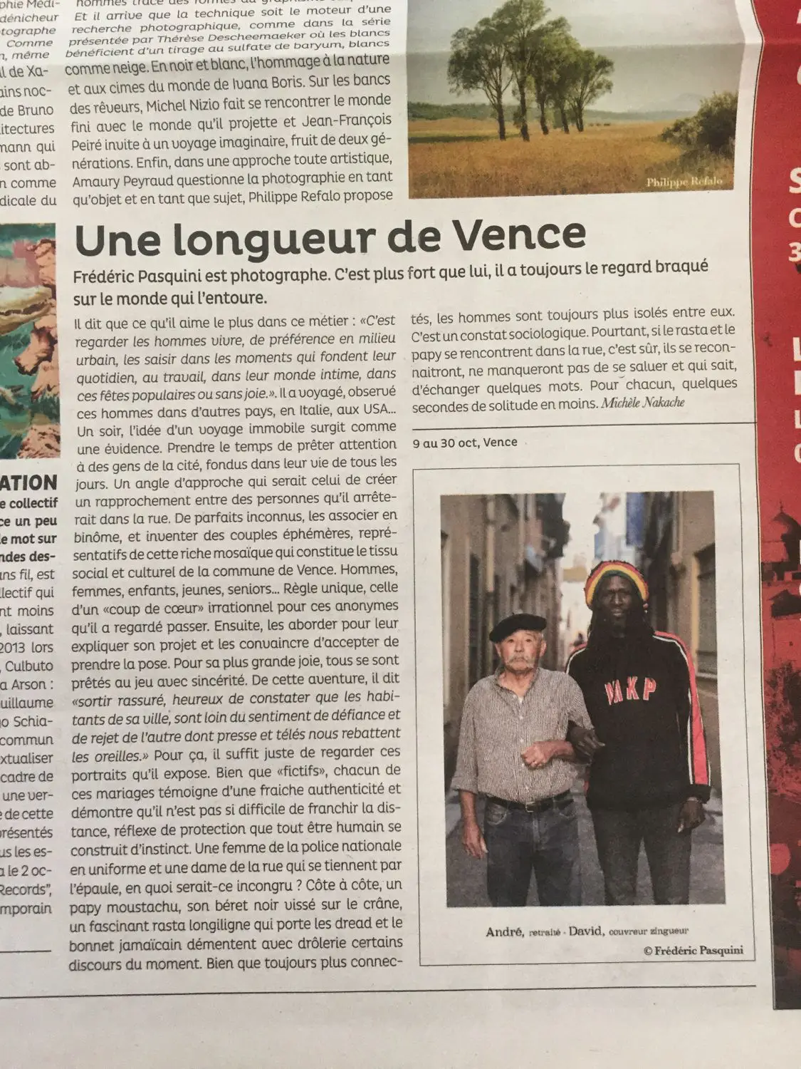 Voici la déclinaison de ce que Frédéric a glané au fil des jours, des rencontres et des échanges. De cette nouvelle aventure, il dit « sortir rassuré, heureux de constater que les Vençois, soient loin d’éprouver ce sentiment de défiance ou de rejet pour l’autre dont la presse nous rebat les oreilles à longueur d’informations.