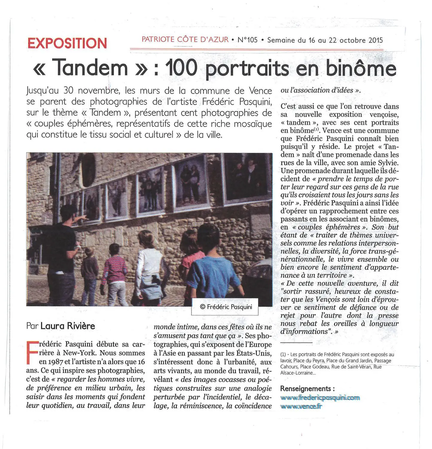 Il s’appelle Frédéric Pasquini, il est photographe. Il aime Vence et ses quelques 20 000 habitants, occupés à batailler avec la vie. C’est plus fort que lui, il a toujours le regard braqué sur le monde qui l’entoure :Une attitude, un mouvement, un geste, un regard, un visage… Il dit que ce qu’il aime le plus dans ce métier qui est d’abord une passion, « C’est regarder les hommes vivre, de préférence en milieu urbain, les saisir dans les moments qui fondent leur quotidien, au travail, dans leur monde intime, dans ces fêtes où ils ne s’amusent pas tant que ça. » Ils sont artistes de jazz, danseurs, simples anonymes, peu importe, tous laissent échapper quelque chose qu’il détecte en eux, dont eux n’ont pas conscience… Il a voyagé, il les a vus ailleurs, en Italie, aux USA, en Asie…